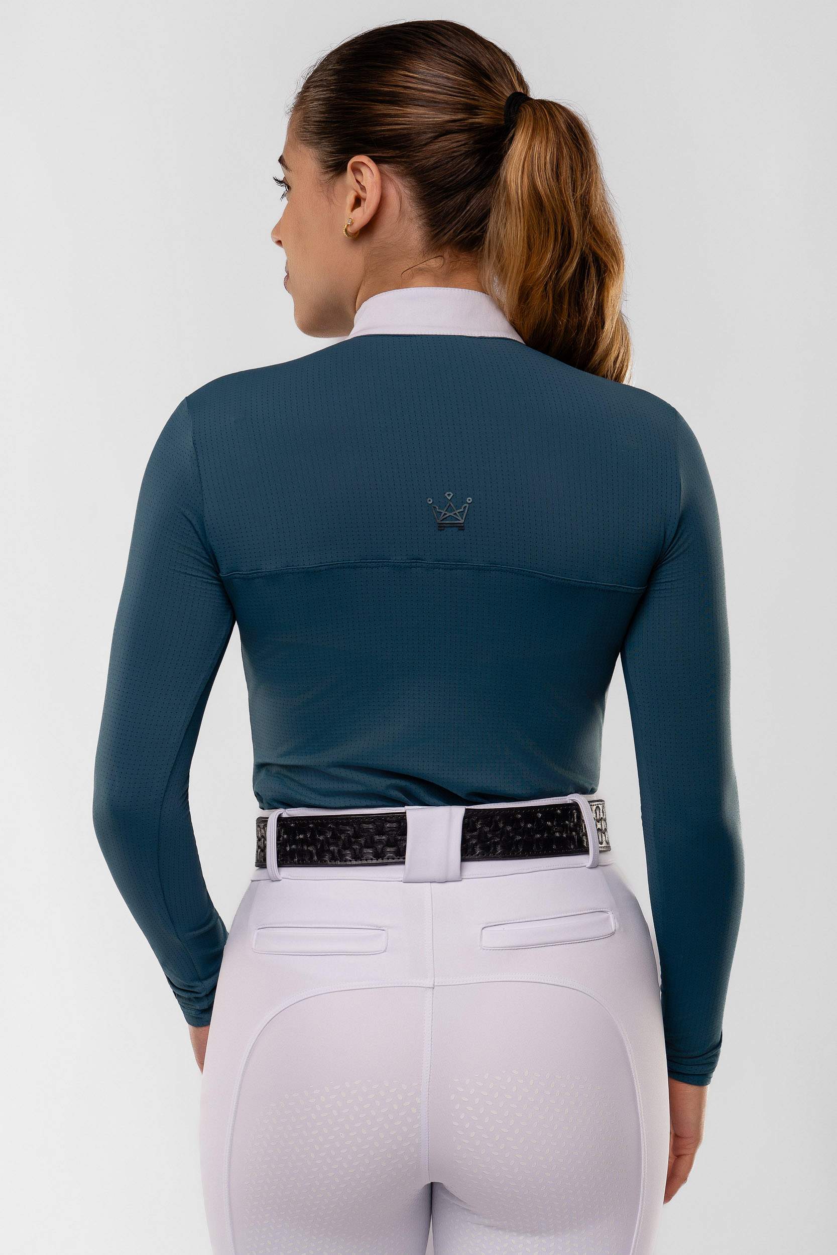 Camisa para hipismo com gola arredondada, recorte no peito e zíper em malha de poliamida e elastano com perfuros e proteção UV 50+. Detalhes em etiquetas termocolantes.