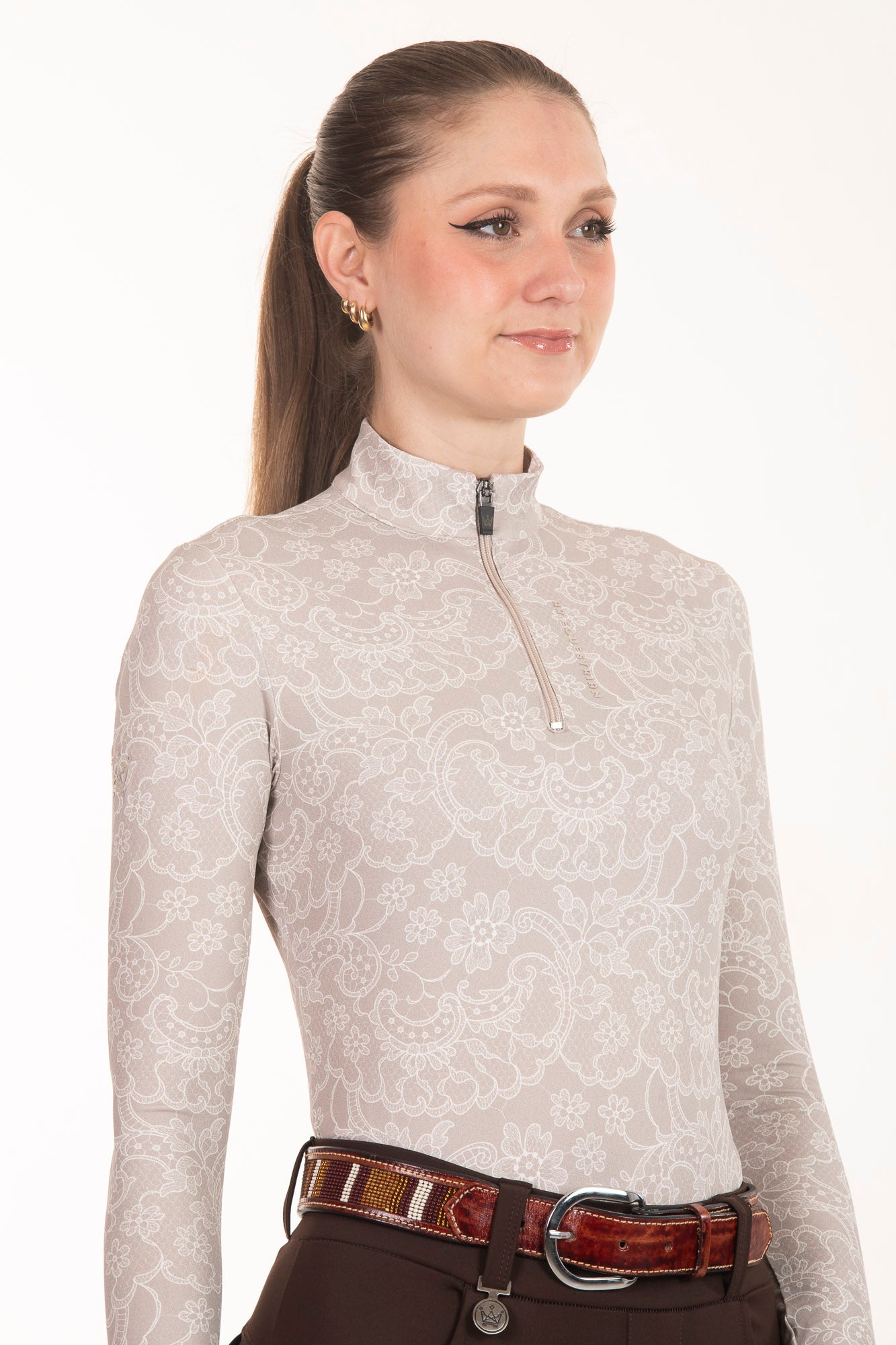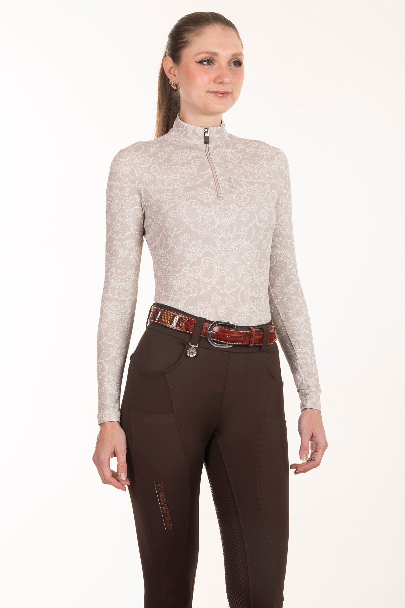 Camisa com gola alta e zíper. Confeccionada em malha de poliamida com elastano.