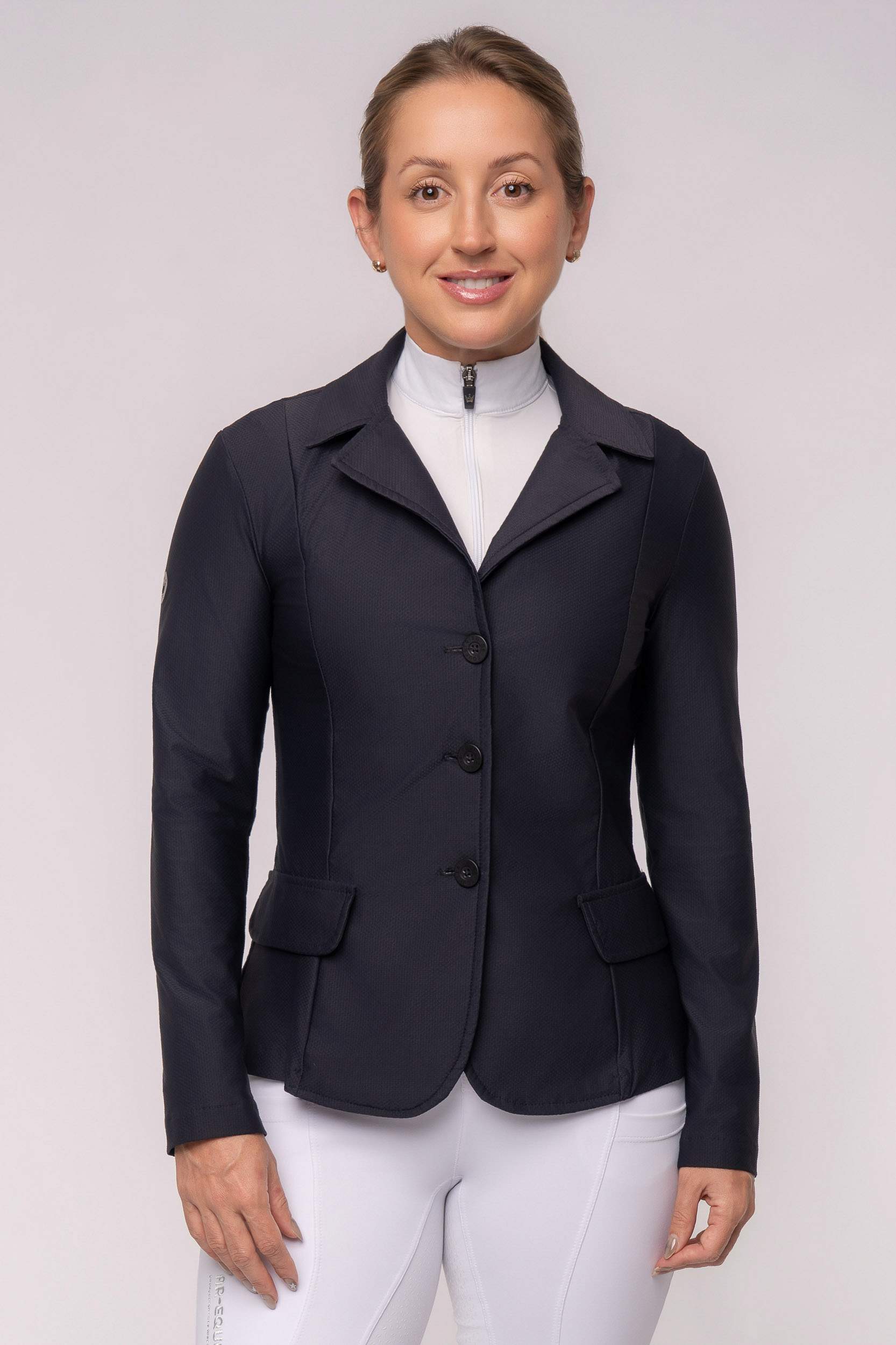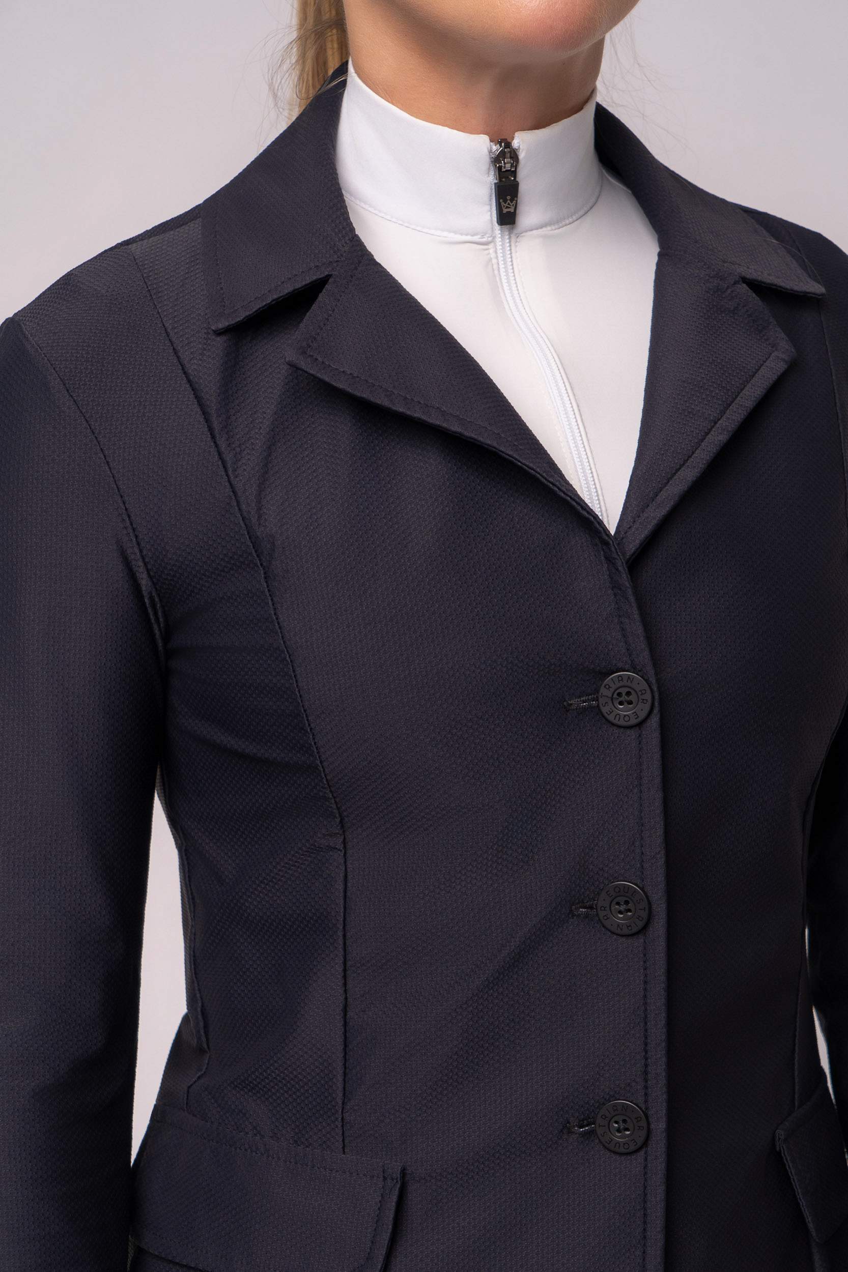 Casaca de hipismo para prova, confeccionada em poliamida com elastano, permitindo o livre movimento dos braços na hora de saltar.