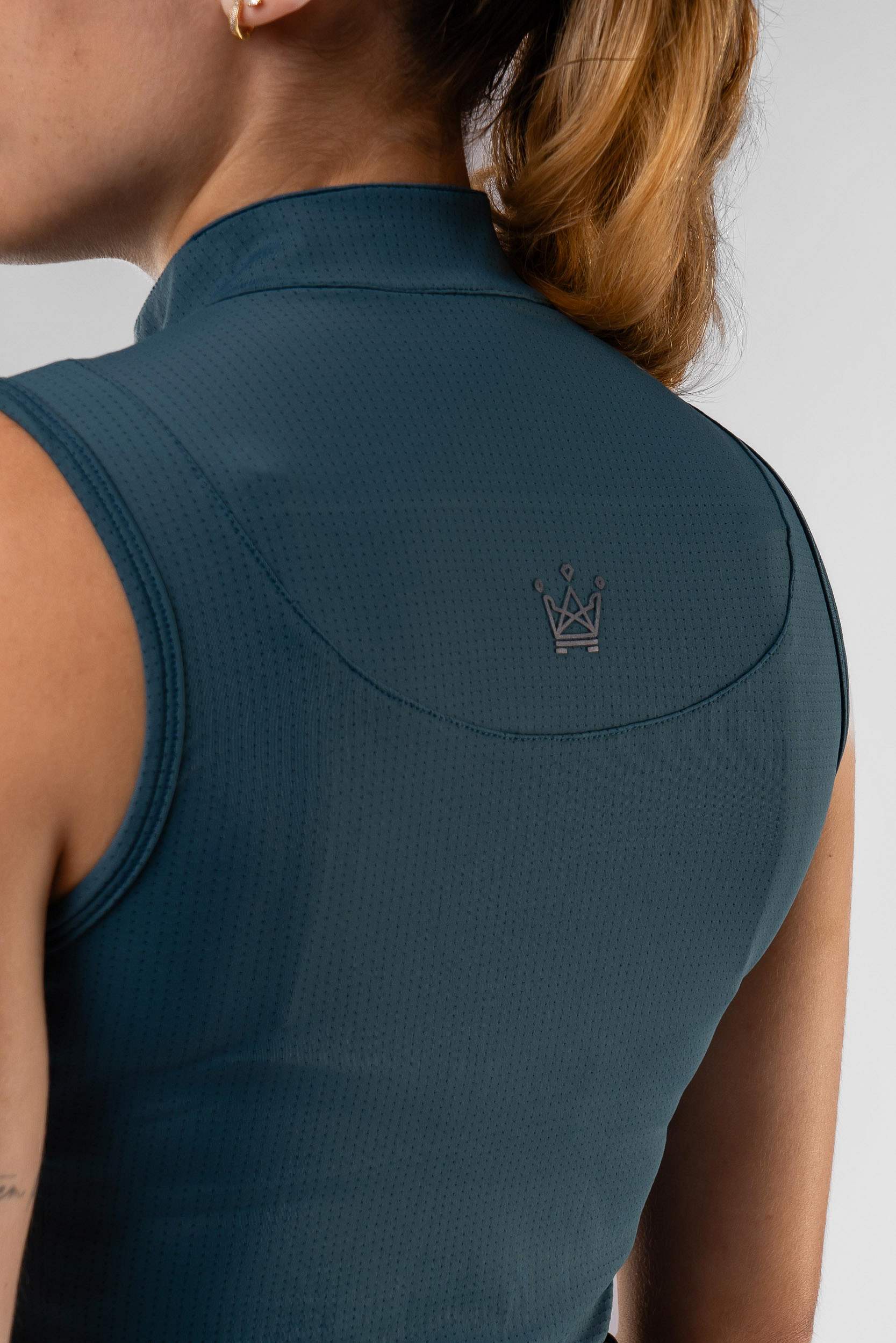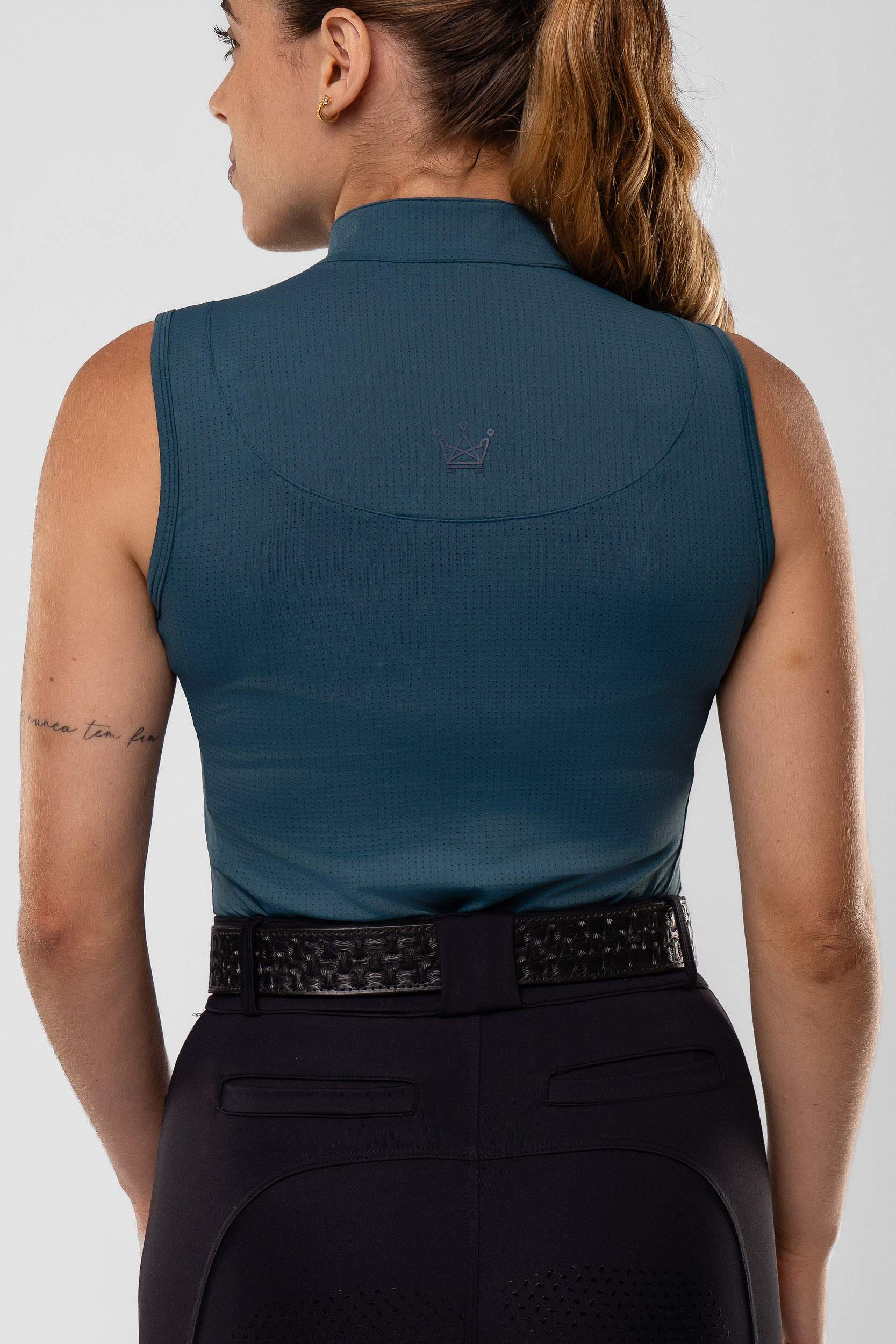 Regata para hipismo com gola arredondada e zíper em malha de poliamida e elastano com perfuros. Detalhes em etiquetas termocolantes, e zíper.