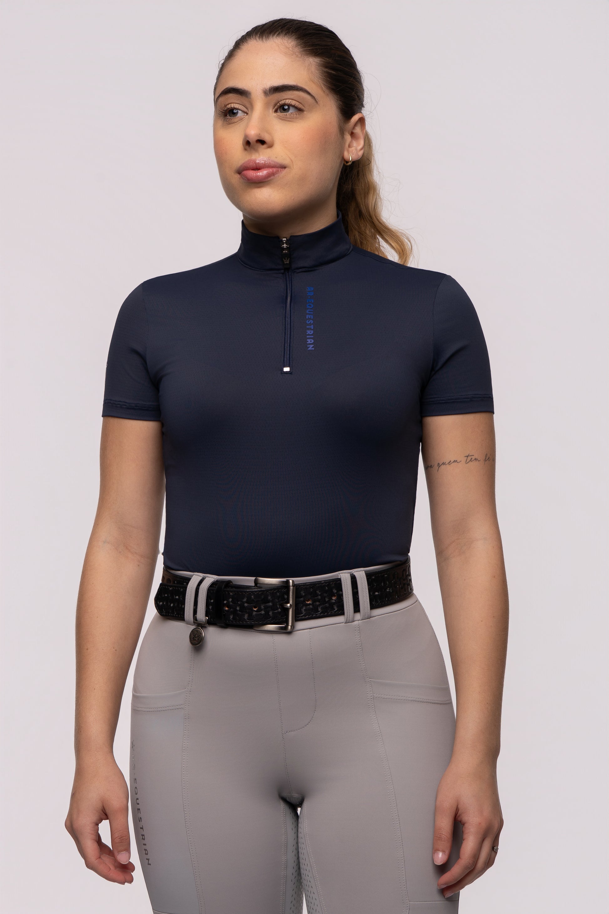 Camisa de manga curta com gola alta e zíper. Confeccionada em malha de poliamida e elastano com perfuros.