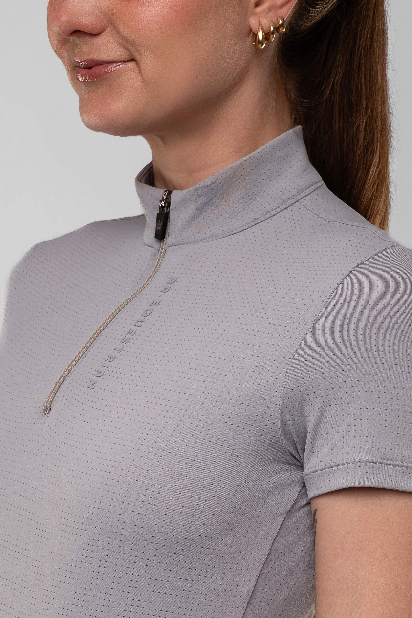 Camisa para hipismo de manga curta com gola alta e zíper em malha de poliamida e elastano com perfuros para maior refrescância.