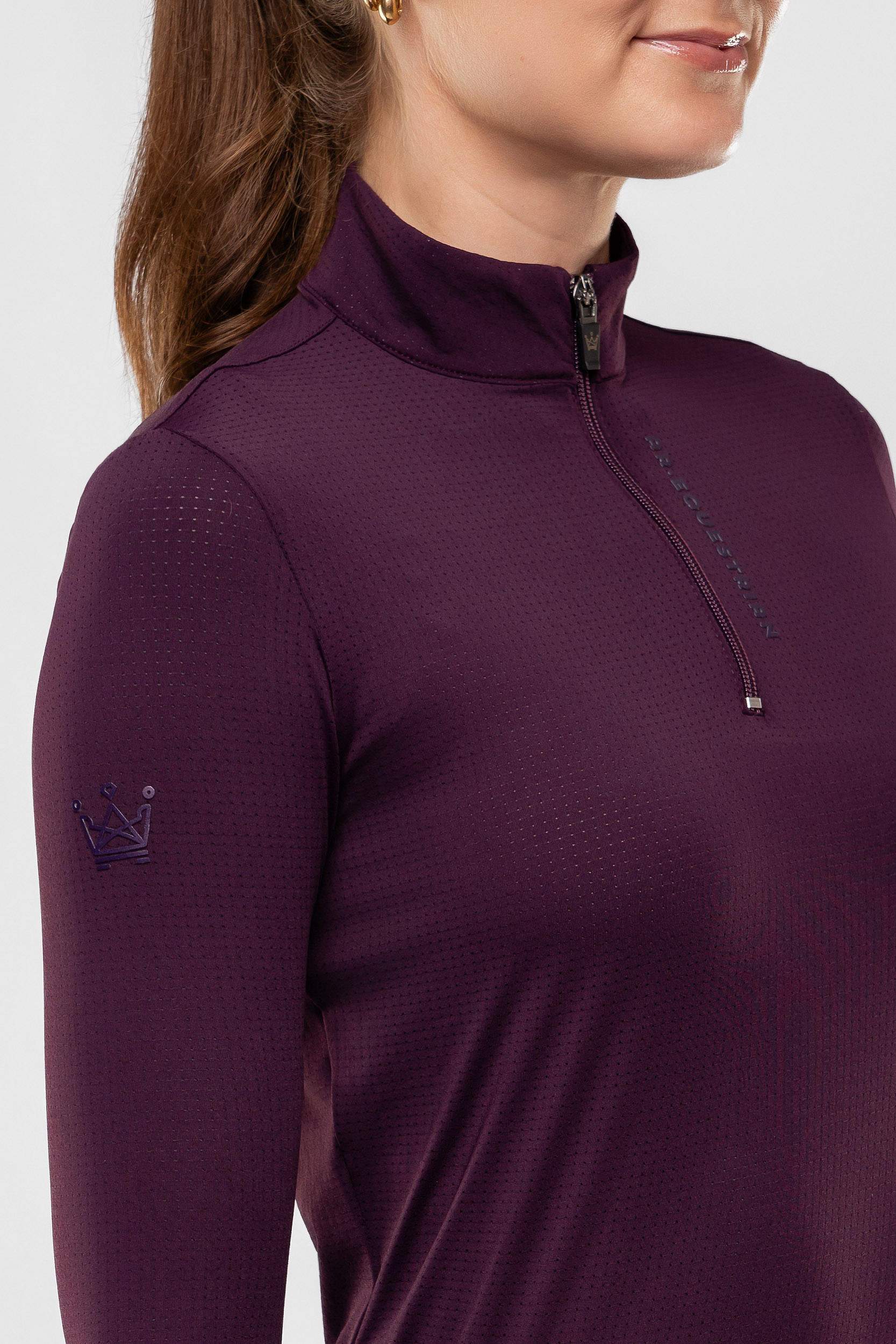 Camisa para hipismo de manga longa com gola alta e zíper em malha de poliamida e elastano com perfuros para maior refrescância.