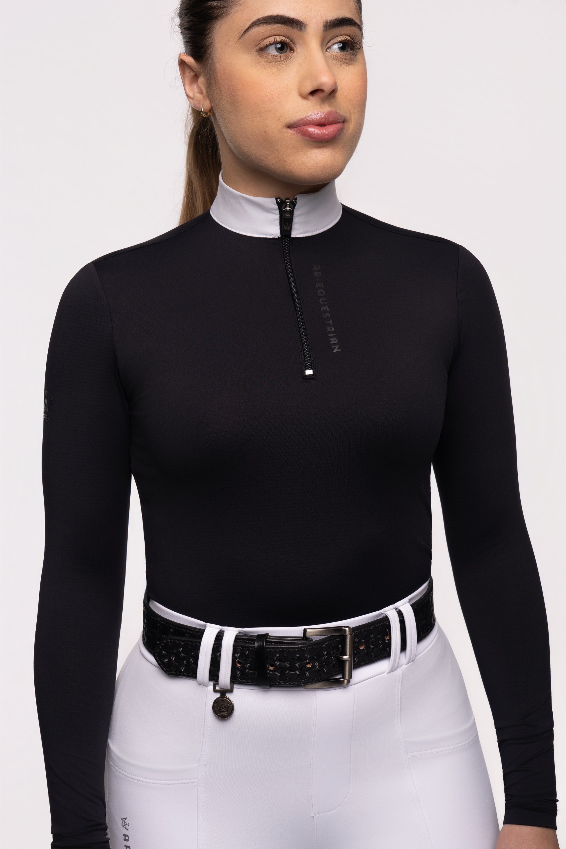 Camisa de manga longa com gola alta e zíper. Confeccionada em malha de poliamida e elastano com perfuros.