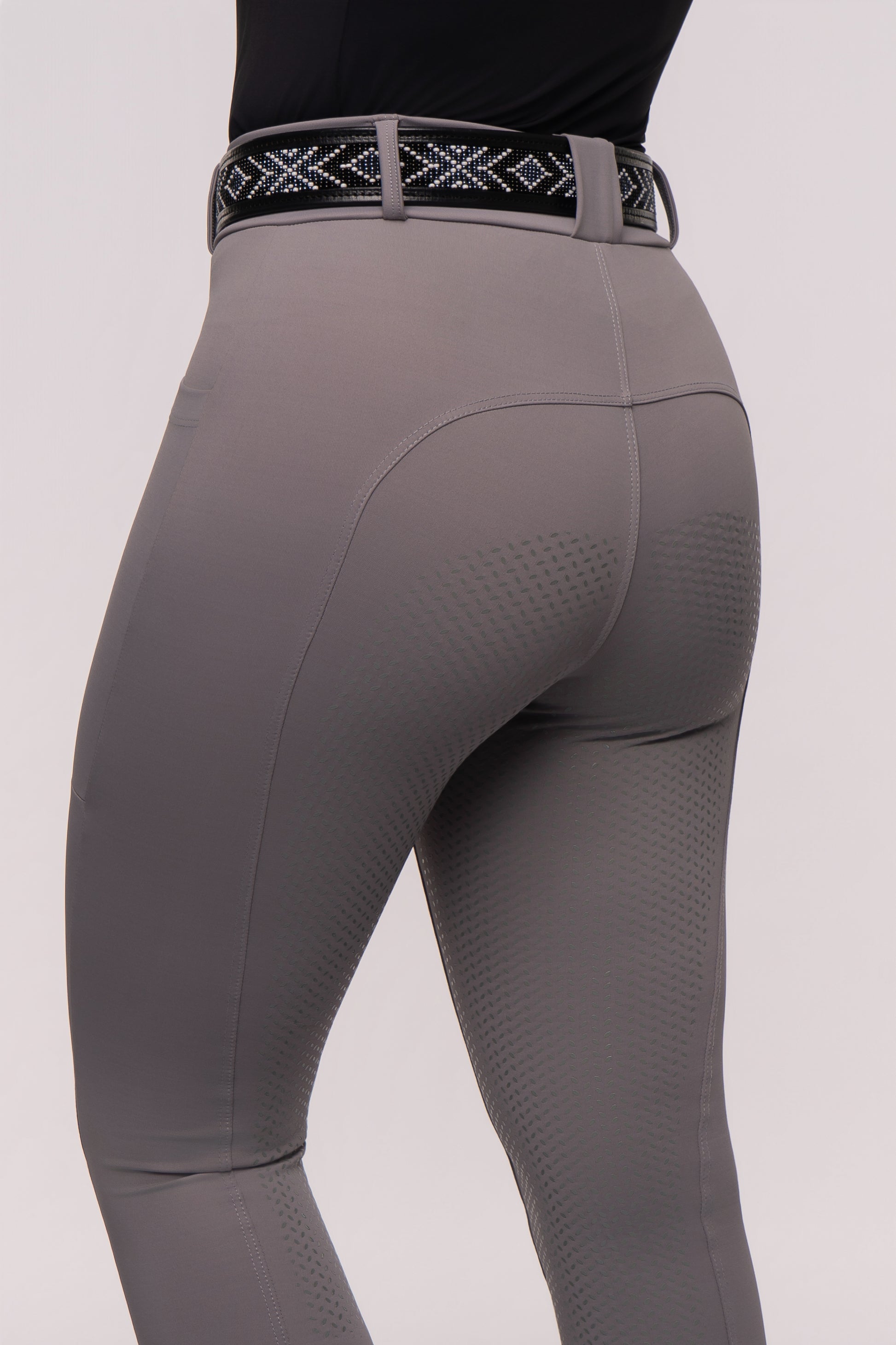 Contém cintura alta e bolsos laterais (ideais para celular), assim como detalhe em estampa. Possui também full grip suave e discreto que proporciona aderência na sela sem grudar.