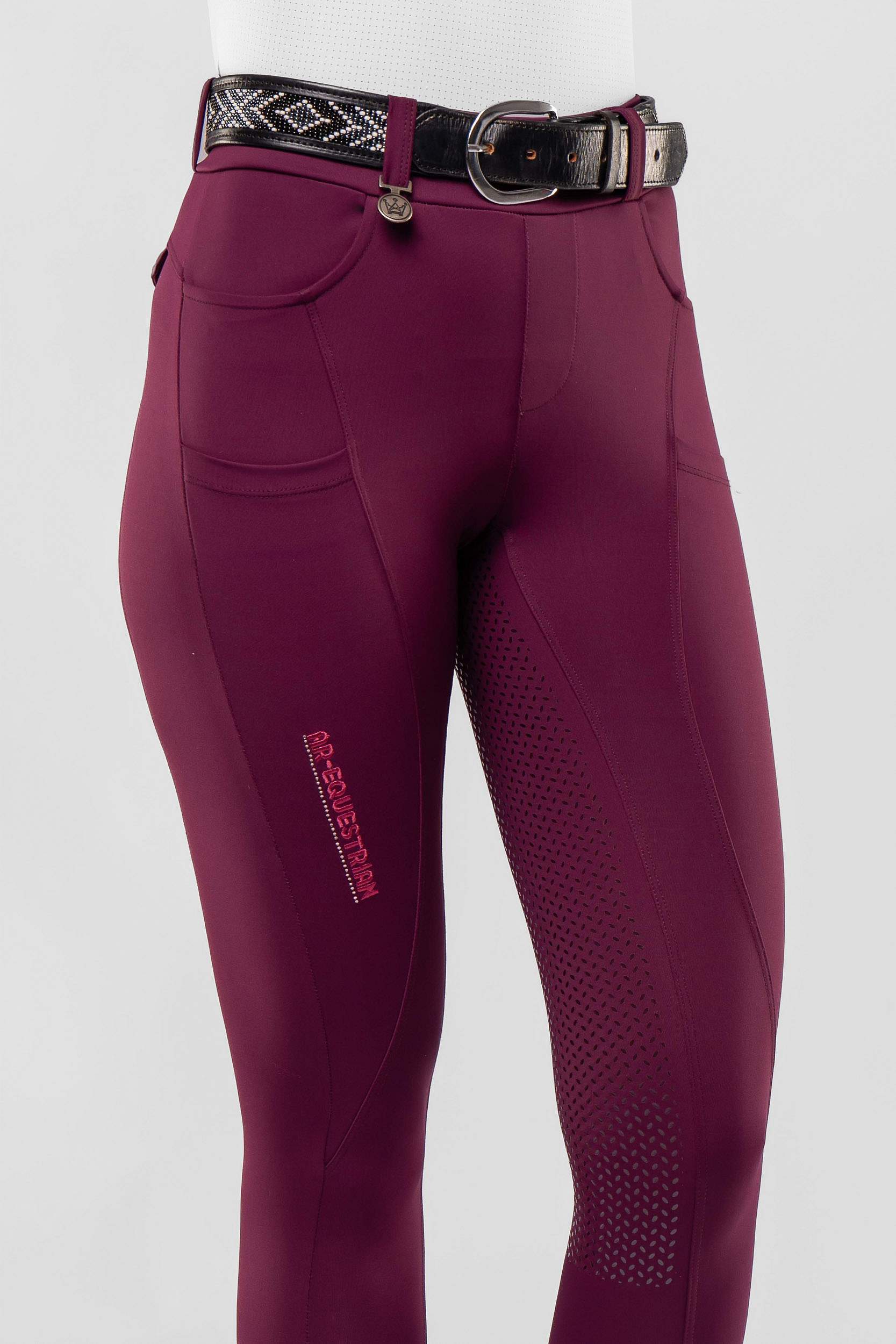 Contém cintura alta, bolsos frontais, bolsos laterais (ideais para celular) e bolsos falsos na parte traseira, assim como detalhes em bordado com aplicação de cristais. Possui também full grip suave e discreto que proporciona aderência na sela sem grudar.
